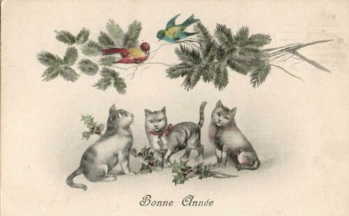 VINTAGE NEW YEAR GREETING postcard: CATS & PRETTY BIRDS 1912