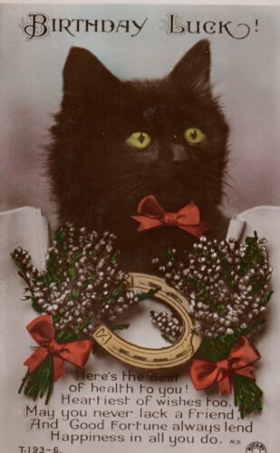 Title (ebay affiliate link): VINTAGE BIRTHDAY GREETING postcard: BLACK CAT HEATHER & HORSESHOE