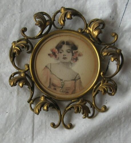 Metal ornate Photo/Picture Frame,7" x 6 1/2" for 4" round photo, Lady watercolor