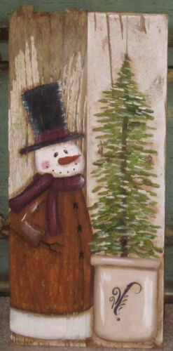 *~*PRIMITIVE*~* HP FOLK ART PRIM SNOWMAN *~* CROCK *~* TREE *~* RECLAIMED WOOD