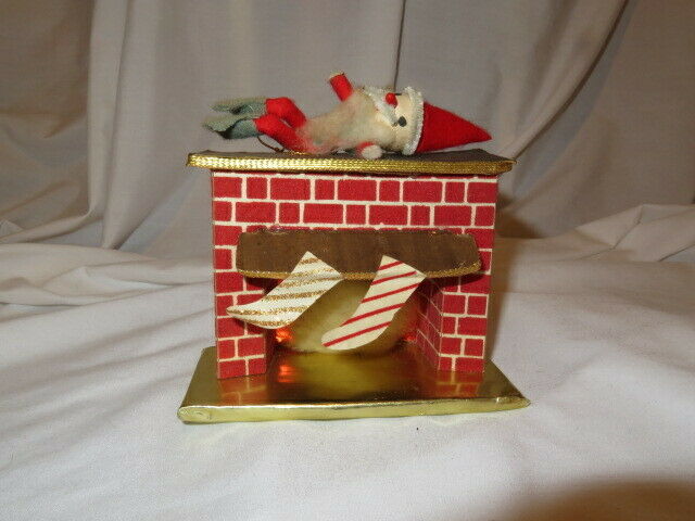 Title (ebay affiliate link): Vtg Christmas Ornament Flocked Cardboard Fireplace Santa Elf on Mantle Japan