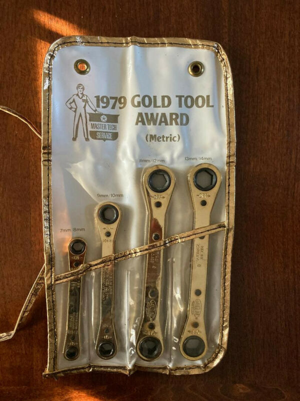 Title (ebay affiliate link): Vintage 1979 Chrysler Gold Tool Award 4 Piece Metric Ratcheting Box Wrench Set