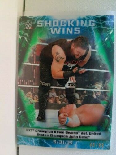 Title (ebay affiliate link): 2020 WWE Topps Chrome Shocking Wins Kevin Owens Green Refractor /99