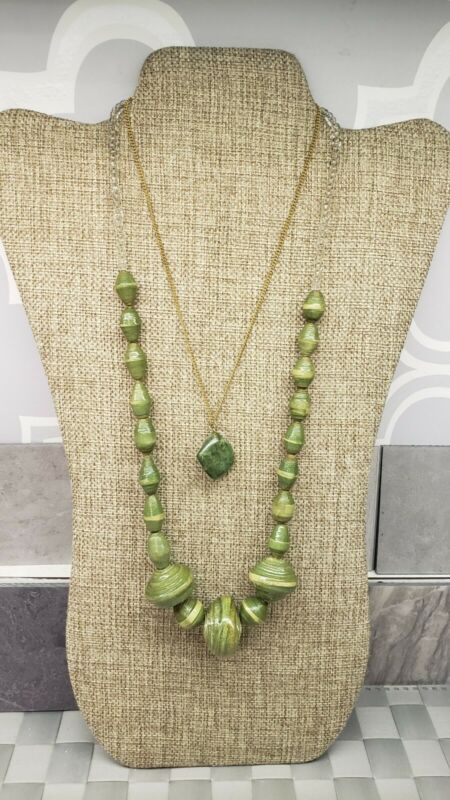 Title (ebay affiliate link): 2 VINTAGE BOHO PAPER BEADED NECKLACE AND GREEN STONE NECKLACE