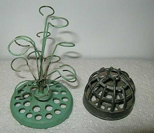 Title (ebay affiliate link): ANTIQUE FLOWER FROGS 2pc WIRE CAST IRON JPO WITH 25 HOLES & METAL CAGE HOLDER