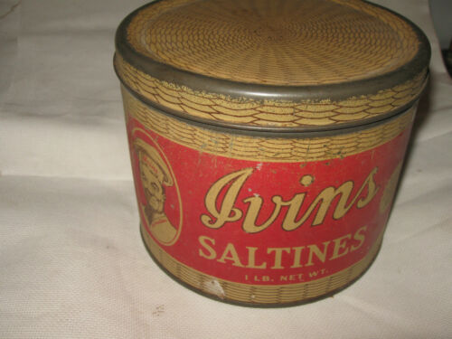 1920s VINTAGE ROUND IVANS SALTINES ADVERTISING TIN