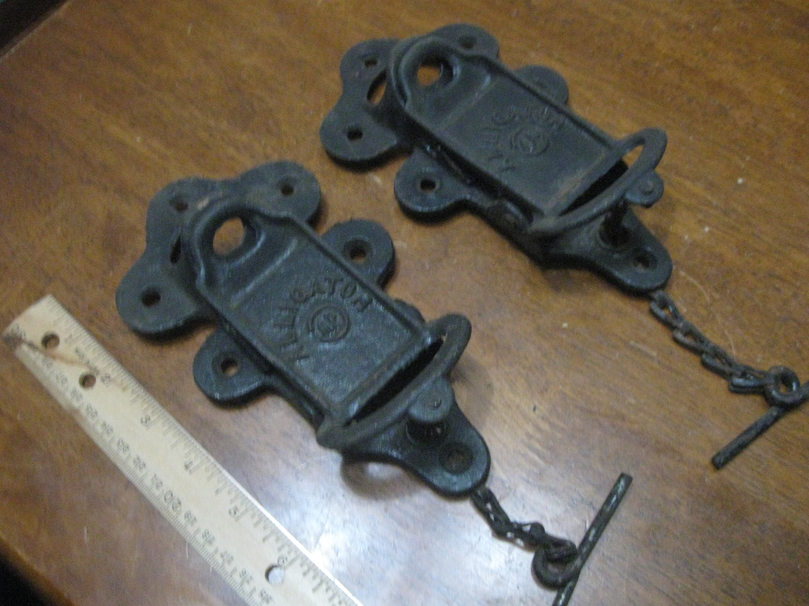Title (ebay affiliate link): Nice Pair Antique Alligator Sliding Door Reverse Latches, Vintage Farm Tools
