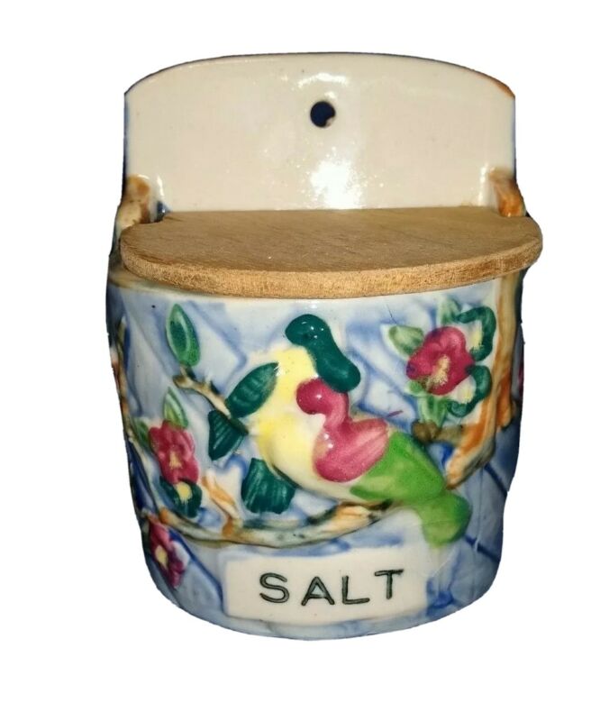 Title (ebay affiliate link): Vtg Wall Mount Salt Box, Japan, Bird Design, Wood Lid