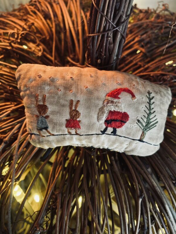 Title (ebay affiliate link): FOLK ART tiny pillow SANTA and his Rabbits Stitchery Primitive