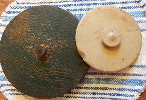 Title (ebay affiliate link): 2 VINTAGE ANTIQUE CROCK OR POT LIDS, 1 WOOD W/ BLUE PAINT