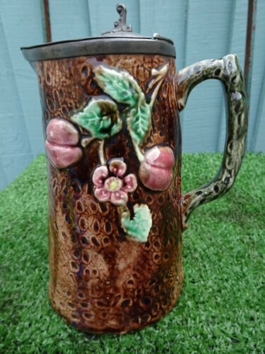 Title (ebay affiliate link): SUPERB 19thC MAJOLICA JUG WITH FRUITS, FLOWERS, & LEAVES WITH PEWTER LID c1880s