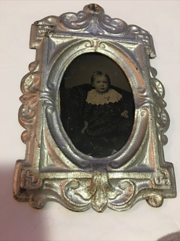 Antique Pressed Tin Metal Picture Frame W Child Photo On Tin