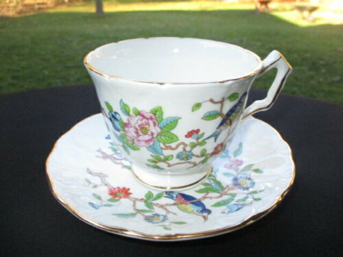 CUP SAUCER AYNSLEY PEMBROKE CROCUS SHAPE VIVID BLUE CHELSEA BIRDS