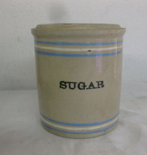 RARE Antique SUGAR CROCK Canister STONEWARE Blue & White STRIPES