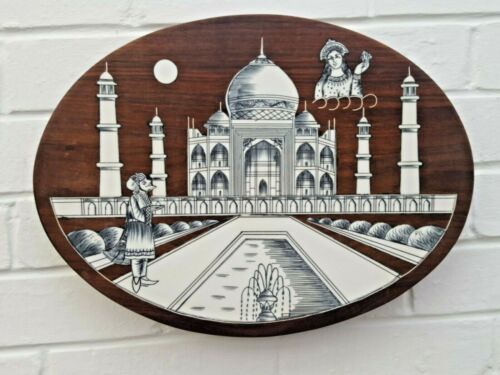 Title (ebay affiliate link): Antique Vintage Wood 16" Table Pot Stand or Wall Hanger - Inlaid Taj Mahal India