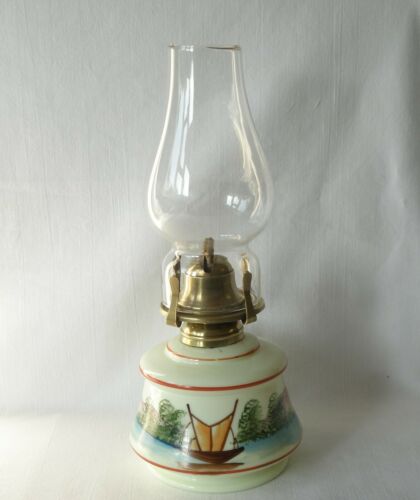 Title (ebay affiliate link): VINTAGE OIL LAMP. TRANSLUCENT GLASS. BRASS FITTINGS. HAND PAINTED BOAT & LAKE.