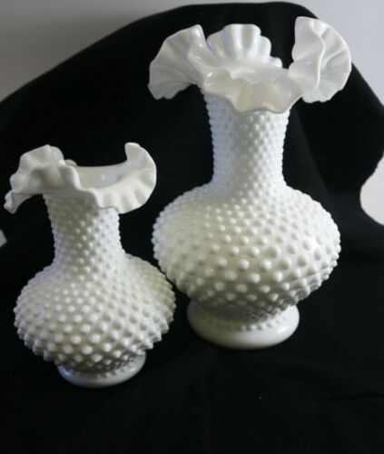 Title (ebay affiliate link): Two Fenton White Hobnail Milk Glass Crimped Ruffled Rim Vases 10.5" & 7"