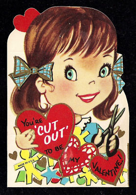 Title (ebay affiliate link): VINTAGE VALENTINE CARD W/ GIRL CUTTING OUT PAPER DOLLS