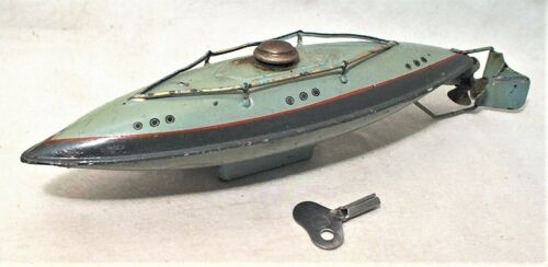 ANTIQUE GERMAN 9" TINPLATE CLOCKWORK SUBMARINE W/ KEY