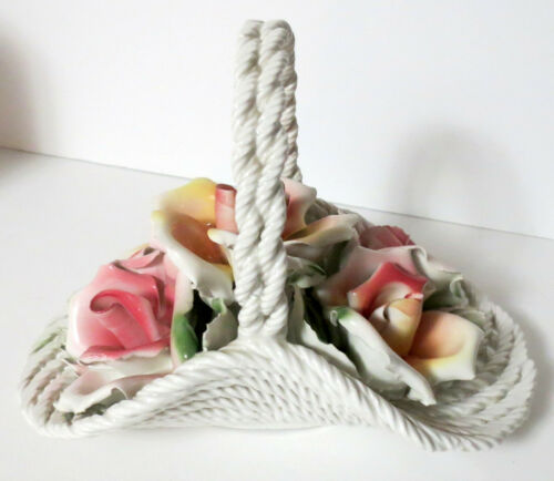 Vintage Porcelain Capodimonte Woven Basket with Roses