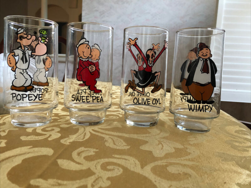 Title (ebay affiliate link): 1975 Cartoon Character Drinking Glasses Popeye Olive Oil Wimpy Pea Coca Cola