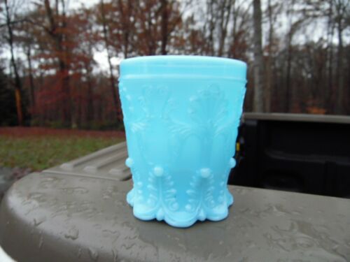 Stunning Ornate Antique Blue Milk Glass Tumbler / Pattern And Maker Unknown
