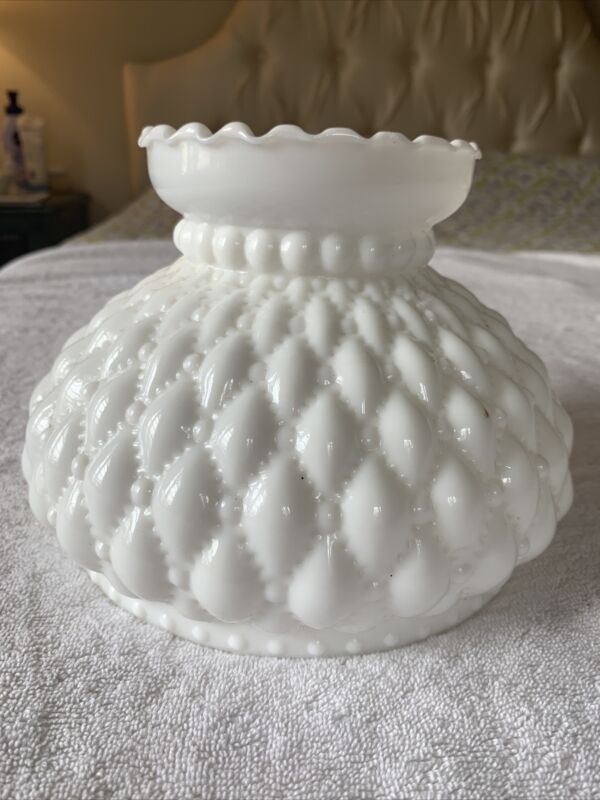 Title (ebay affiliate link): VTG Lamp Shade Milk Glass White Hobnail Student Hurricane Ruffled Top 7" Fitter