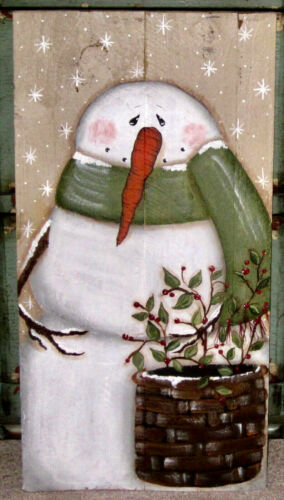 *~*PRIMITIVE*~* HP FOLK ART PRIM SNOWMAN * BASKET * WINTER *~* RECLAIMED WOOD