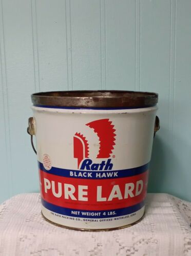 Title (ebay affiliate link): Vintage Rath Black Hawk Pure Lard 4 Lb Tin Advertising Display Can Bucket Pail
