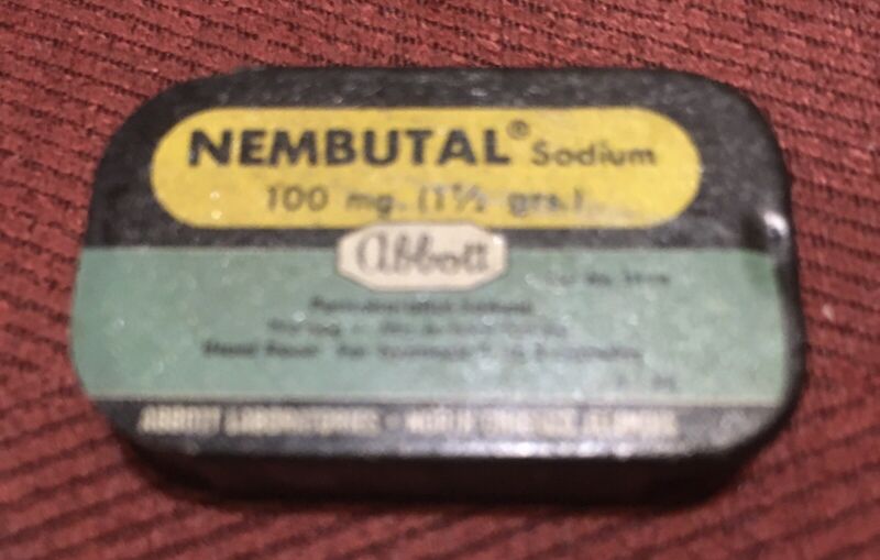 Title (ebay affiliate link): Antique Medicine Tin: Nembutal by Abbott Mini Size. Empty, Excellent Condition.