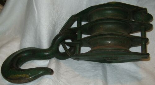 ANTIQUE BLOCK & TACKLE PULLEY TRIPLE CHANNEL ORIGINAL GREEN PAINT