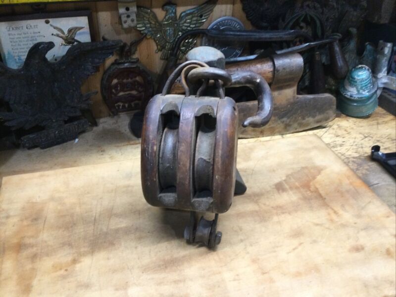 Vintage Wooden Double Pulley Block And Tackle Barn Farm Nautical