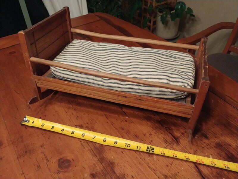 Title (ebay affiliate link): Antique Hand Made Wooden Doll Cradle Doll Bed with Feather Mattress 15 x 8 x 8