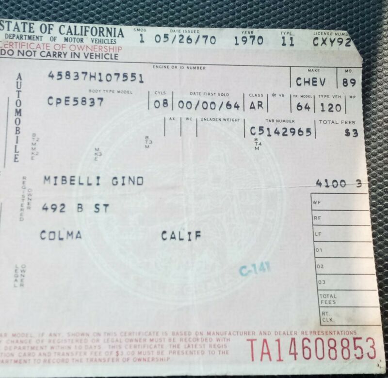 Title (ebay affiliate link): 1964 Chevrolet Malibu SS 2dr Sports Coupe California Title-Historical Documents