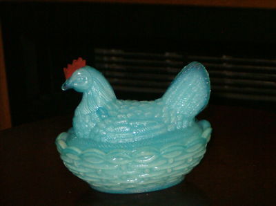 GORGEOUS VINTAGE BLUE MILKGLASS COVERED 3 1/2" HEN DISH