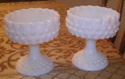 Pair Vintage Milk Glass Hobnail Pedestal Candy Dishes