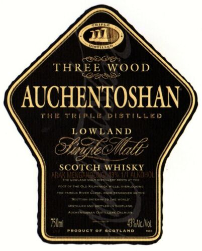 Title (ebay affiliate link): Auchentoshan Three Wood, Triple Distilled, Lowland Single Malt Whisky label.