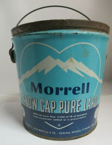 Title (ebay affiliate link): Vintage Morrell Snow Cap Pure Lard 4 Pound Tin Bucket with Wire Handle