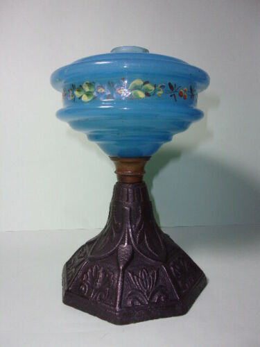 Title (ebay affiliate link): ANTIQUE OIL LAMP CAST IRON BASE, BLUE GLASS RESERVOIR.