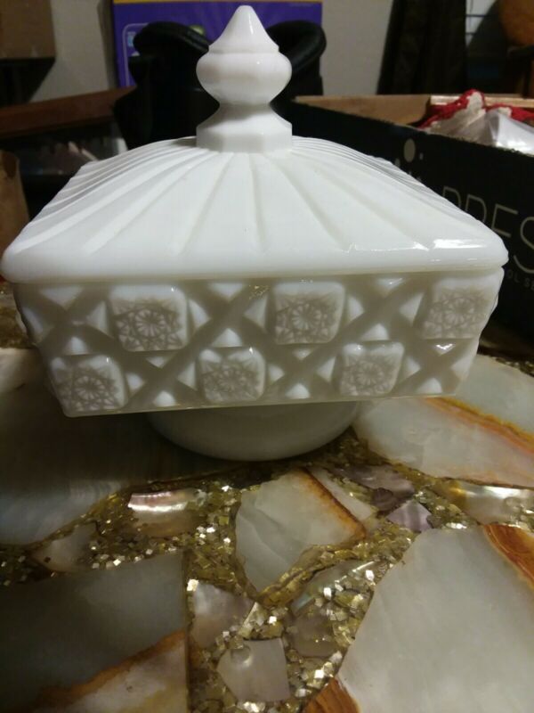 Title (ebay affiliate link): Vintage Westmoreland Old Quilt Covered Square Compote Candy Dish Milk Glass