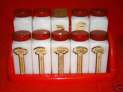 WHITE MILK GLASS SPICE JAR RED BAKELITE WALL RACK SET