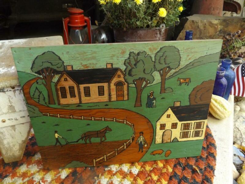 Sweet Primitive Vintage Paint By Number on Wood Farm Scene in Spring