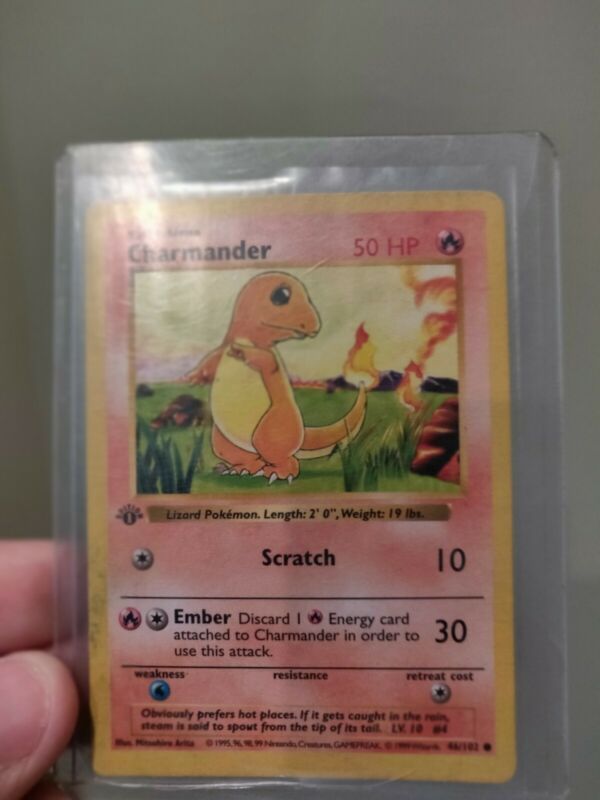Title (ebay affiliate link): 1st edition Shadowless Charmander 46/102 Pokemon card (water stain)