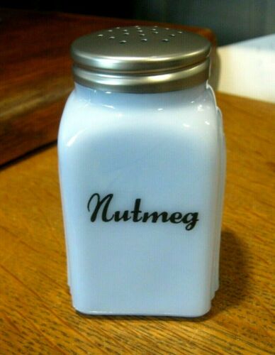 Title (ebay affiliate link): DELPHITE BLUE MILK GLASS "Nutmeg" SHAKER Arched Sides Black Lettering 4" a