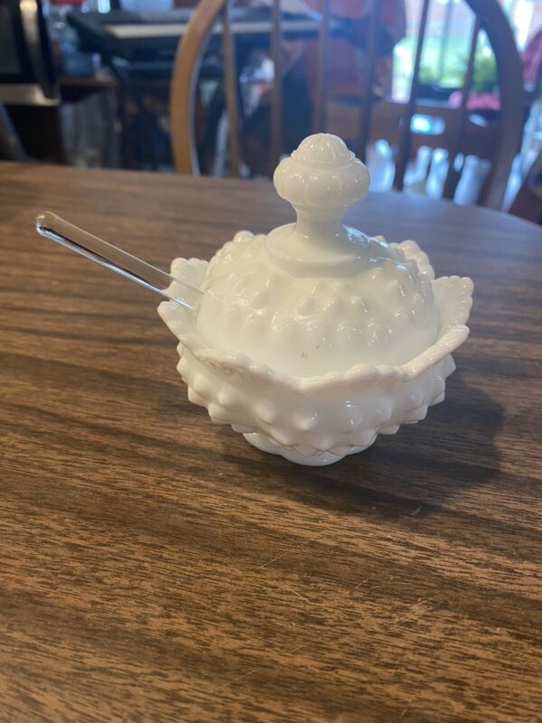 Vintage Fenton Hobnail Sugar Bowl with Lid And Glass Spoon ~ Rare