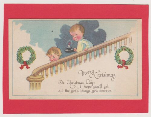 Title (ebay affiliate link): VINTAGE 1919 CHRISTMAS-CHRISTMAS MORNING-CUTE CHILDREN-DOWN THE STAIRS