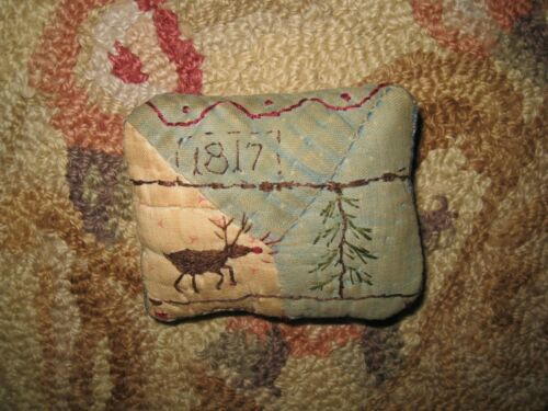 Primitive tiny Sampler Pillow~1817 The Red Nose Reindeer~ Early quilt~Folk Art