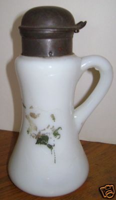 Antique milk glass syrup pitcher w/tin flip top lid,