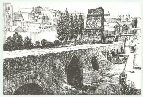 Unused Pencil Sketch PC of the Old Exe Bridge, Exeter, Devon