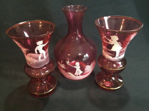 Title (ebay affiliate link): 3 Antique Mary Gregory Cranberry Enamel Glass Vases Pair w/ Girl Boy & Bird
